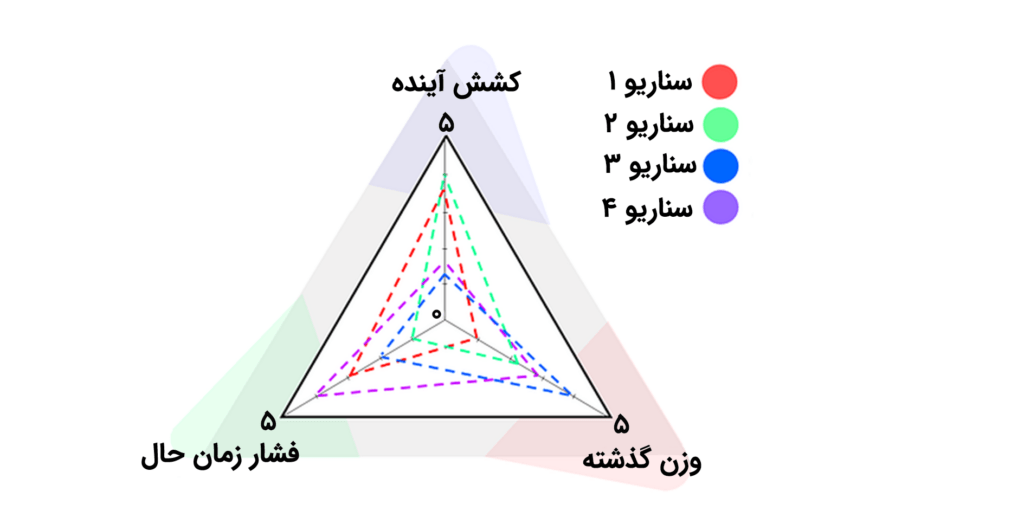 - امتیازدهی به سناریوها: در این مرحله، هر سناریو بر اساس میزان تسلط آن بر سه بعد مثلث آینده (فشارها، کششها و وزنها) از 0 تا 5 امتیازدهی میشود. این فرآیند معمولاً در یک تیم انجام میشود تا با میانگینگیری امتیازها، سوگیری کاهش یابد. نتیجه این مرحله، یک شکل گرافیکی مثلث آینده است که نشان میدهد هر سناریو چگونه این سه بعد را ترکیب کرده است.